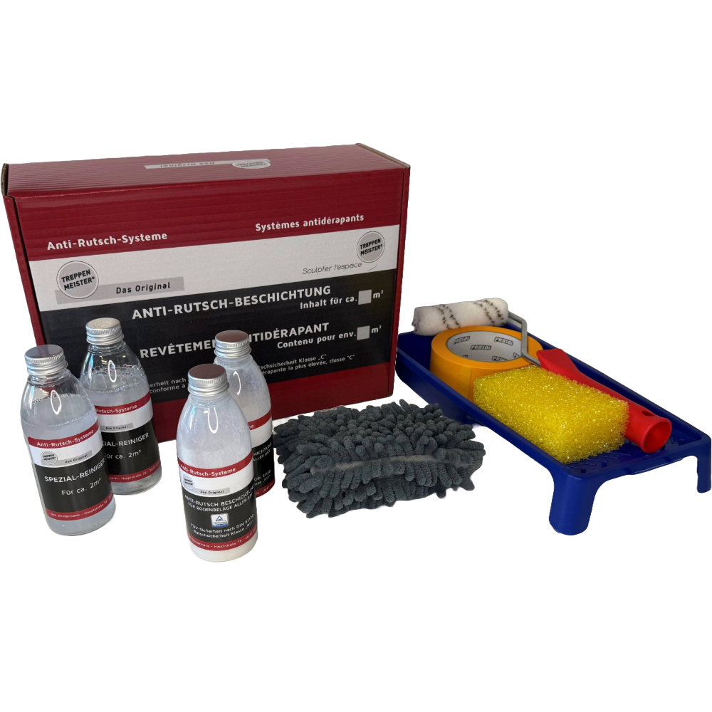 Der Rutschschutz für Treppen aus Stein, Granit, Holz und anderen Materialien. Ideal, um Ihre Holztreppe rutschfest zu machen. Das Antirutschsystem reicht für bis zu 4 Quadratmeter oder eine Treppe mit 14-16 Stufen. Ermöglicht eine nach TÜV DIN 51097 geprüfte und in die höchste Rutschsicherheit Klasse C eingeordnete Rutschhemmung. Testen Sie gerne Haptik und Optik unseres Treppen-Rutschschutzes, bevor Sie sich für einen Kauf entscheiden. Eigens dafür stellen wir Ihnen ein Haptikmuster zur Verfügung, das bei einem anschließenden Kauf sogar kostenlos für Sie ist.